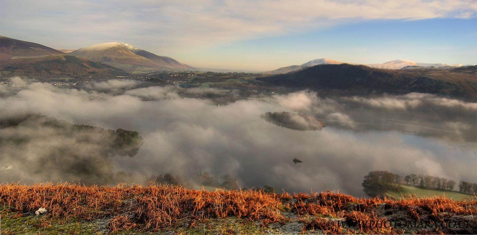 Blencathra with a snow capped peak and mist on Derwent Water Camera: Canon Digital IXUS 400 [full size 1555px X 768px]