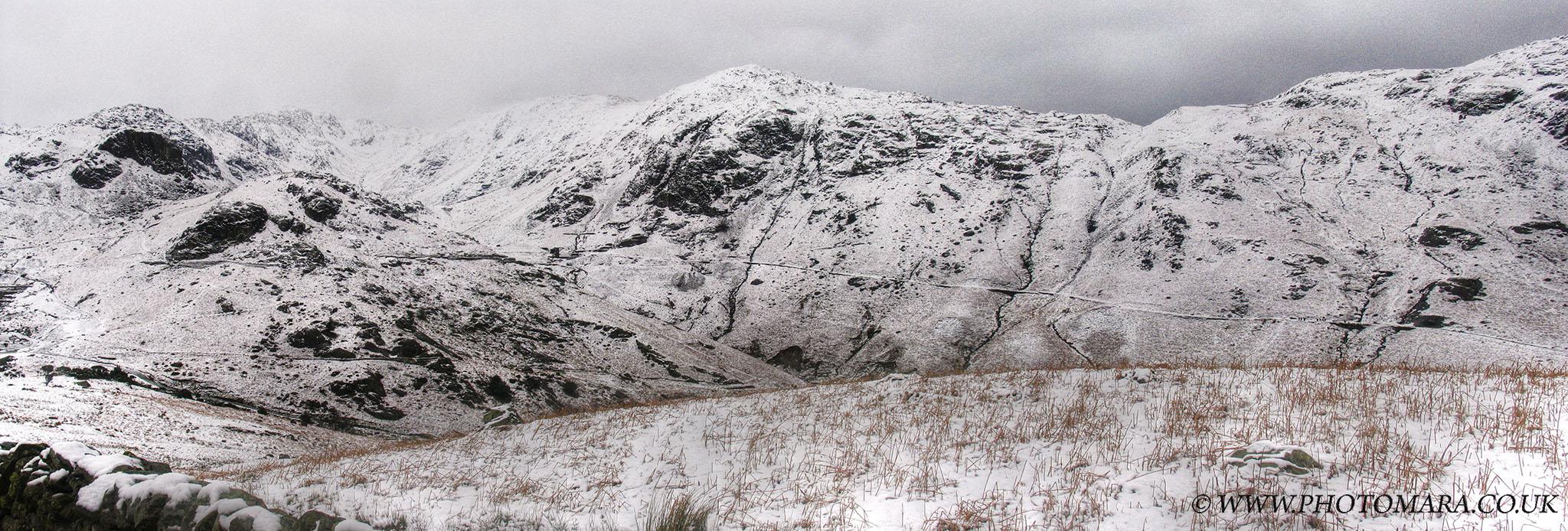 The Coniston Fells with a dusting of snow make a bleak sight but also a beautiful one Camera: Canon Pro1 [full size 2048px X 694px]