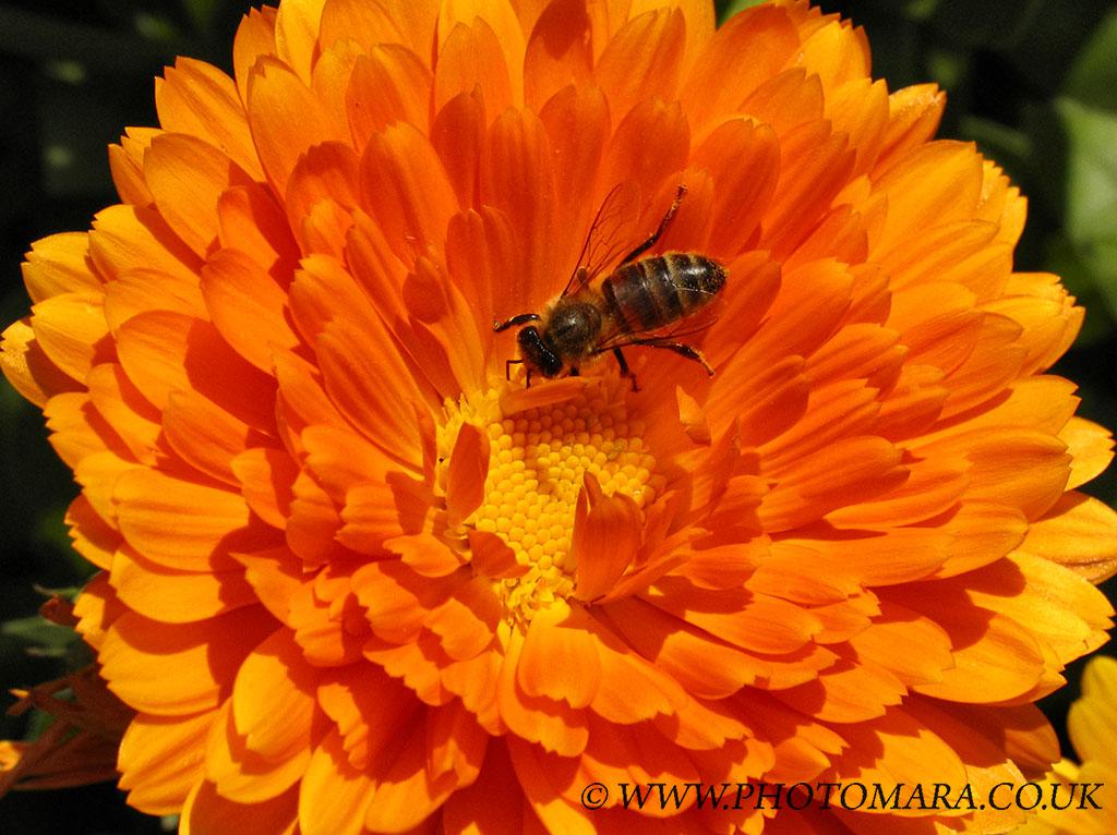 A Bee on a Marigold flower. This bright flower does it's job of attracting insects very well. Camera: Canon Pro1 [full size 1024px X 766px]
