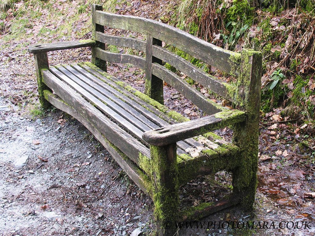 Moss slowly encroaching on a bench at Tarn Hows