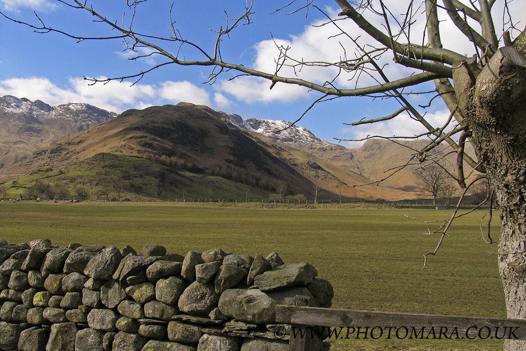 Looking across the fields of sheep towards The Band from the Langdale valley